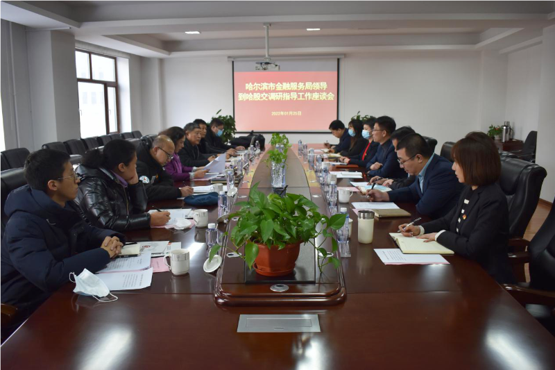 新聞中心 > 子公司動態(tài) 1月25日下午,哈爾濱市金融服務(wù)局局長孫婉睿一行到哈爾濱股權(quán)交易中心(以下簡稱哈股交)調(diào)研指導(dǎo)工作。哈爾濱市金融服務(wù)局副局長邵偉、副局長陳方暉等一同參加調(diào)研。哈股交黨支部書記、董事長王全武主持調(diào)研座談會并作工作匯報,哈股交中層以上管理人員參加調(diào)研座談會。