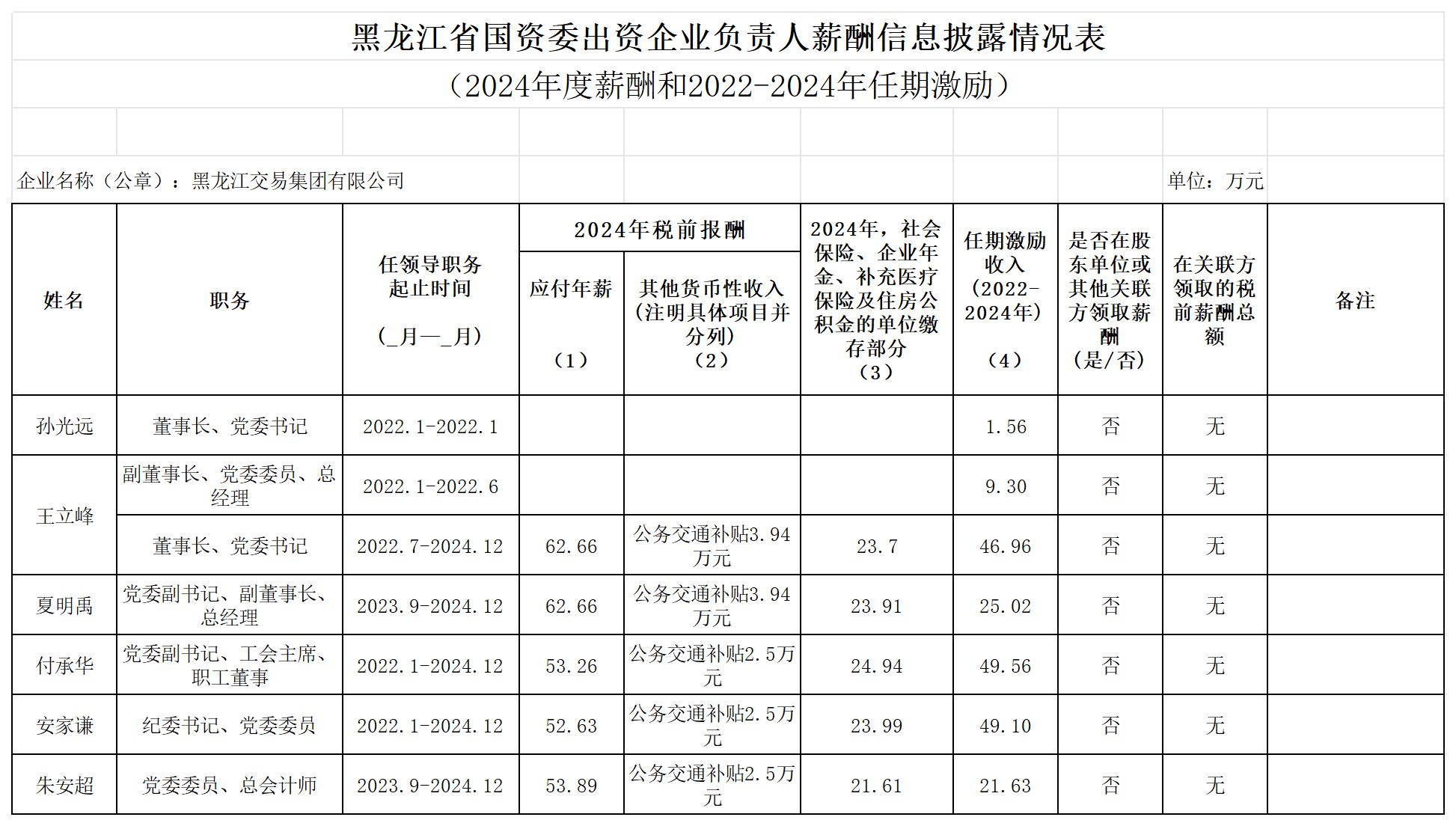 按照《黑龍江省國(guó)資委出資企業(yè)負(fù)責(zé)人薪酬管理辦法》黑國(guó)資分〔2016〕202號(hào)文件精神,黑龍江交易集團(tuán)有限公司對(duì)由省國(guó)資委管理的領(lǐng)導(dǎo)班子成員2024年度薪酬和2022-2024年任期激勵(lì)信息向社會(huì)披露如下。