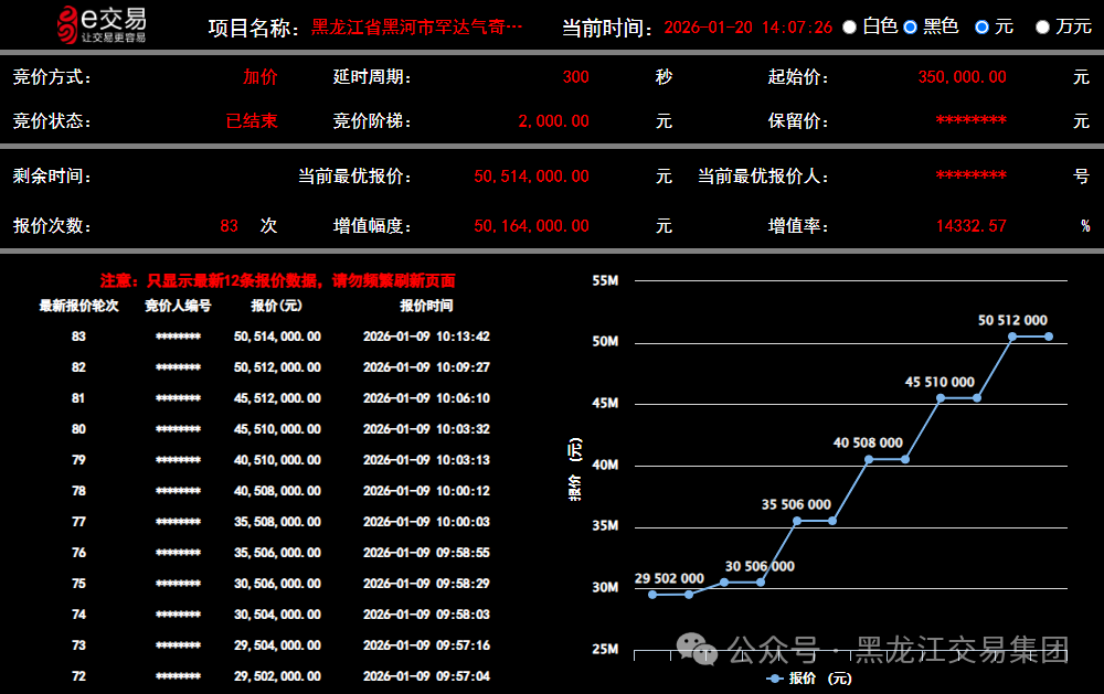新聞中心 > 子公司動(dòng)態(tài)歷經(jīng)4711輪市場(chǎng)競(jìng)價(jià),最終以平均溢價(jià)4035.72%的價(jià)格成交!近日,受省自然資源廳委托,在黑龍江交易集團(tuán)自然生態(tài)交易中心掛牌出讓的第3批次金屬礦勘查等11個(gè)區(qū)塊探礦權(quán)出讓項(xiàng)目全部順利成交,成交價(jià)格創(chuàng)下黑河地區(qū)礦產(chǎn)資源出讓新高。這充分彰顯了自然生態(tài)交易中心市場(chǎng)平臺(tái)要素資源高質(zhì)高效配置功能作用,為龍江自然生態(tài)資源通過市場(chǎng)手段,實(shí)現(xiàn)資源向產(chǎn)業(yè)、要素向動(dòng)能轉(zhuǎn)化路徑的實(shí)踐樣本。